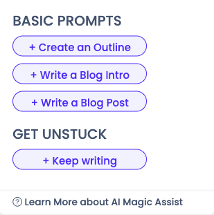 Step 1: When you click "Write a blog post," you can copy and paste the entire outline and blog post intro that the AI magic assist created in the "Write a blog post" section, and you can also write instructions below the outline and blog post intro, such as "Write the rest of the blog post from the above outline and blog post intro."